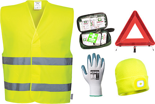 A Portwest jármű készlet tartalmazza a szükséges eszközöket amelyekkel meghibásodás vagy baleset esetén növelheti a biztonságát.-C474 jól láthatósági mellény X1-A310 védőkesztyű X2-HV10 elakadásjelző háromszög X1-B028 dupla LED-es sapka X1-FA21 elsősegély készlet X1