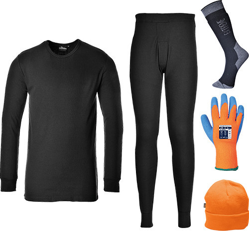 A Portwest extrém időjárás készlet hat létfontosságú terméket tartalmaz az extrém hideg környezetben dolgozók számára.-SK18 zokni X1-A145 védőkesztyű X3-B013 kötött sapka X1-B121 jégeralsó X1-B123 hosszú ujjú póló X1